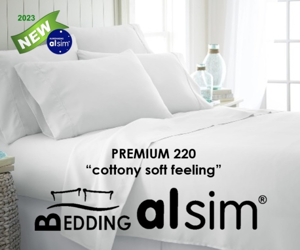 Tela blanca de importación de la más alta calidad internacional 50% algodón/ 50% poliéster de 220 hilos, tacto de algodón “Cottony Soft Feeling”.